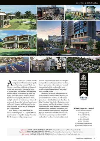 Highly Commended MIXED-USE DEVELOPMENT UGANDA Pearl Marina Development by Athena Properties Limited Highly Commended RESIDENTIAL DEVELOPMENT KENYA Maiyan Residential Development by Athena Properties Limited Highly Commended MIXED-USE DEVELOPMENT KENYA Two Rivers Development by Athena Properties Limited Africa & Arabia Property Awards