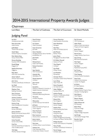 Peter Bolton-King Group Director, RICS Doreen Boulding Founder, DMB Consultants Russell Bragg Bragg & Co Stephen Brownless Gaggenau Peter Bush CEO, New Swansea Bay Xavier Calloc’h Director, Yacht Investor John Cetra Architect, CetraRuddy Architecture Ian Chalk ORMS Architecture Matthew Clare Building Consultant Sean Cochrane Cochrane Design Andrew Cockburn Design Director, International Property Media Katrina Craig Hotel Development Consultant David Dalby Former CEO, RICS Johnny Dunford Global Commercial Director, RICS James Dunford-Wood Hotel Consultant Imtiaz Farookhi Former CEO, NHBC Fred Finn Guinness World Record holder for most travelled person Will Gibbs MD, KLC School of Design