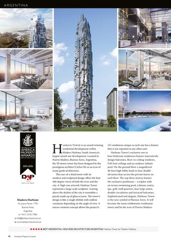 T an award-winning residential development within Madero Harbour, South America’s largest mixed-use development. Located in Puerto Madero, Buenos Aires, Argentina, the 50-storey tower has been designed by the prestigious architect Carlos Ott as an icon of avant-garde architecture. This one-of-a-kind tower with its modern and sculptural design offers the best 360-degree views of both the river and the city. A ‘high-rise artwork’, Harbour Tower represents a large-scale sculpture. Soaring above the skyline of the city it resembles a puzzle made up of glass screens. The tower’s design is like a rough obelisk with endless variations depending on the angle of view. A mirror rotation concept allows the project’s
