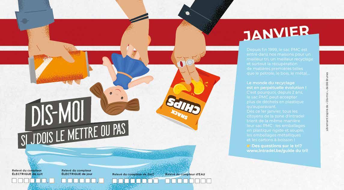 Conseils à suivre : Collecte des PMC via le Sac Bleu • Vos papiers-cartons doivent être glissés dans une boite en carton résistante, ils ne peuvent être présentés en vrac. • Le seul contenant en plastique autorisé est le conteneur jaune de chez Intradel, aucun autre contenant en plastique ne peut être utilisé pour la collecte. ou Cartons Collecte des Papiers-Cartons En porte-à-porte ou via les recyparcs Papiers Papiers propres non souillés Cartons propres non souillés et aplatis INTERDITS - À TRIER COMME SUIT : Films en plastique Déchets organiques Déchets résiduels Papiers et cartons souillés Farine Sacs de ciment Matériels scolaires Sac Bleu Films Sacs et sachets Capsules de boissons Barquettes et raviers Pots Flacons Bouteilles Emballages en Plastique Rigide Tubes Canettes et boîtes de conserve Aérosols Barquettes et raviers Couvercles, bouchons et capsules Capsules de boissons Emballages Métalliques Emballages en Plastique Souple Cartons à boissons Briques et berlingots