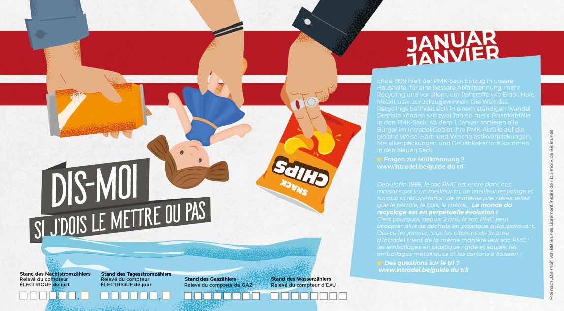 Vergessen Sie nicht, Ihren Abfäll rechtzeitig an die Straße zu stellen. N’oubliez pas de sortir vos poubelles à temps. Erkundigen Sie sich bei Ihrer Gemeindeverwaltung, wann Sie Ihren Müll am Vorabend herausstellen können. Achtung: Die Fahrpläne der Müllabfuhr können variieren. So vermeiden wir, dass nicht abgeholte Abfälle auf wilden Müllkippen landen und Sie müssen Ihren Müllsack nicht wieder hereinholen und bis zur nächsten Abholung aufbewahren. Renseignez-vous auprès de votre administration communale afin de connaitre l’heure à laquelle vous pouvez les sortir la veille. Attention, les horaires des camions peuvent varier. Grâce à cela, nous éviterons que des dépôts tardifs ne deviennent des dépôts clandestins et vous, cela vous évite de rentrer votre sac et de le conserver jusqu’à la collecte suivante.