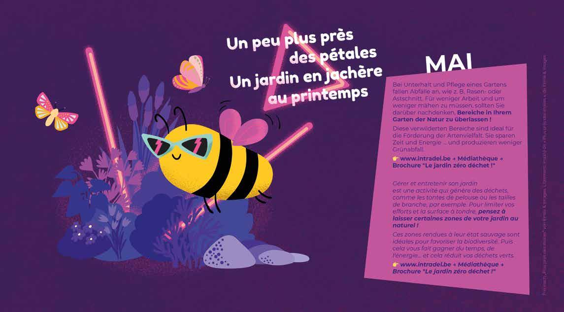 In Zusammenarbeit mit Natagora haben wir außerdem beschlossen, unsere Grünanlagen bewusster zu gestalten: Pflanzen, die wenig Pflege benötigen (weniger Grünabfall) und die Artenvielfalt fördern; Pflanzen, die sich gegenseitig schützen und somit weniger Pflanzenschutzmittel benötigen, die als Haushalts-Sondermüll eingestuft sind und daher sehr kostenaufwendig im Recycling.