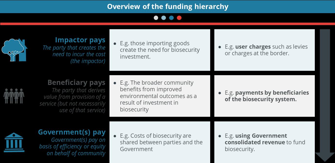 4. From an economic perspective, the funding hierarchy for biosecurity requires that funding be first sought from risk creators/impactors, then beneficiaries, and finally, government. The mechanisms assessed in this report suggest there are opportunities to receive more funding from a range of relevant parties, including from biosecurity risk creators.