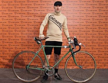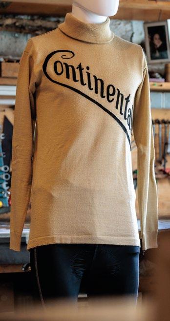 Im beginnenden 20. Jahrhundert gewandete sich der Radfahrer von Welt, zumeist Franzose, bevorzugt in schmal geschnittene Wollpullover. Als Schutz vor Wind und Kälte mussten lange Ärmel und Rollkrägen genügen, denn die zu Pionierszeiten schickliche Ergänzung mit langen Strümpfen, Kniehosen und festen Joppen war Geschichte. Dafür trugen die Herren Garin, Aucouturier, Cornet, Trousselier, Crupelandt, Pélissier, Ganna und wie die frühen Sieger von Tour de France, ParisRoubaix, Paris-Brest-Paris oder Giro d’Italia alle hießen, häufg um die Schulter geschlungenen Ersatzreifen, Stoffmützen und Fliegerbrillen. Sponsorennamen wie auf dieser Reproduktion eines Pullis der 9 er-Jahre waren in jener heroischen Epoche noch eine Seltenheit. Nicht zuletzt, weil die 1903 erfundene Tour de France eigentlich bis zum 1. Weltkrieg eine strikt individuelle Prüfung blieb, bei der Mannschaften offziell verboten waren.