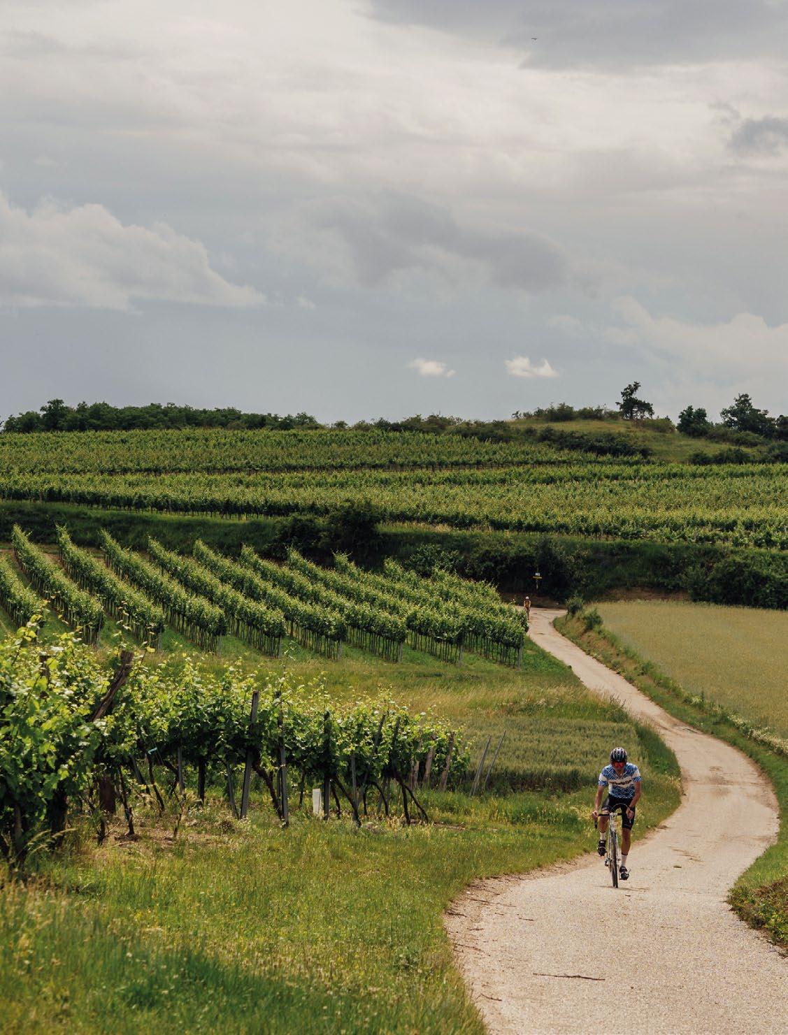 rund im Takt weiter. Auch auf der Strecke fiegen im Vorbeifahren – und seltener beim Überholen –Wortfetzen heran, die von der Zeitlosigkeit und Liebhaberei und Leidenschaft künden, die uns durch das Weinviertel bewegen. Manches klingt dann wie ein heiliges Gebot für Rad-Apostel, wie ein Gesetz aus einer Welt, die einerseits eine große Renaissance erlebt und andererseits gar nie verschwunden war. „Stahl überlebt halt“, sagt einer. Und einer sagt zu meinem Bruder, der mit einem goldfarbenen KTM unterwegs ist: „Oh, was für eine echte Schönheit.“ Und weil es immer noch halbwegs fach ist, bleibt Luft und ich erinnere mich an meine erste Liebe, die sich nie erfüllte. Rot-Schwarz-Gelb. TI-Raleigh. Ich bin nicht sicher, ob es damals das Rad war oder der Name des Mannes, der es fuhr: Joop Zoetemelk. Das klang nach einer erstrebenswerten Ferne. Und dann schau ich hoch. In der Ferne, ein paar Hügel weiter, ist hinter ein paar Weinfeldern schon der Rathausturm von Retz zu sehen und die Windmühle. Da müssen wir hin. Dazwischen geht es halt noch einmal hinunter. In Hügel Veritas.