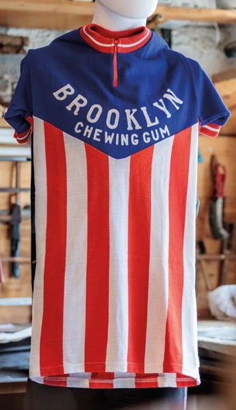 Gleichzeitig gab und gibt es bei der KlassikerRundfahrt durchs Weinviertel alle Jahre wieder wahre textile Schätze zu bestaunen: Das gelbe Trikot des allzeit jüngsten Österreich-Rundfahrtssiegers von 1981, Gerhard Zadrobilek, oder das 7-Eleven-Jersey desselben, mit dem er 1989 seinen ersten Weltcup-Sieg in San Sebastian einfuhr. Ausgesprochen viele Puch-Trikots – wir sind hier schließlich in Österreich – in diversen Macharten und Designs, am legendärsten wohl jene aus Wolle und mit rot-weiß-rot gestreiften Ärmeln, wie sie beispielsweise der vierfache Glocknerkönig Rudi Mitteregger original trug. Das übergroße Nationalteam-Trikot der Österreichischen Meisterin Hanni Hack mit seinen roten Rückentaschen, dem gebogenen „Austria“-