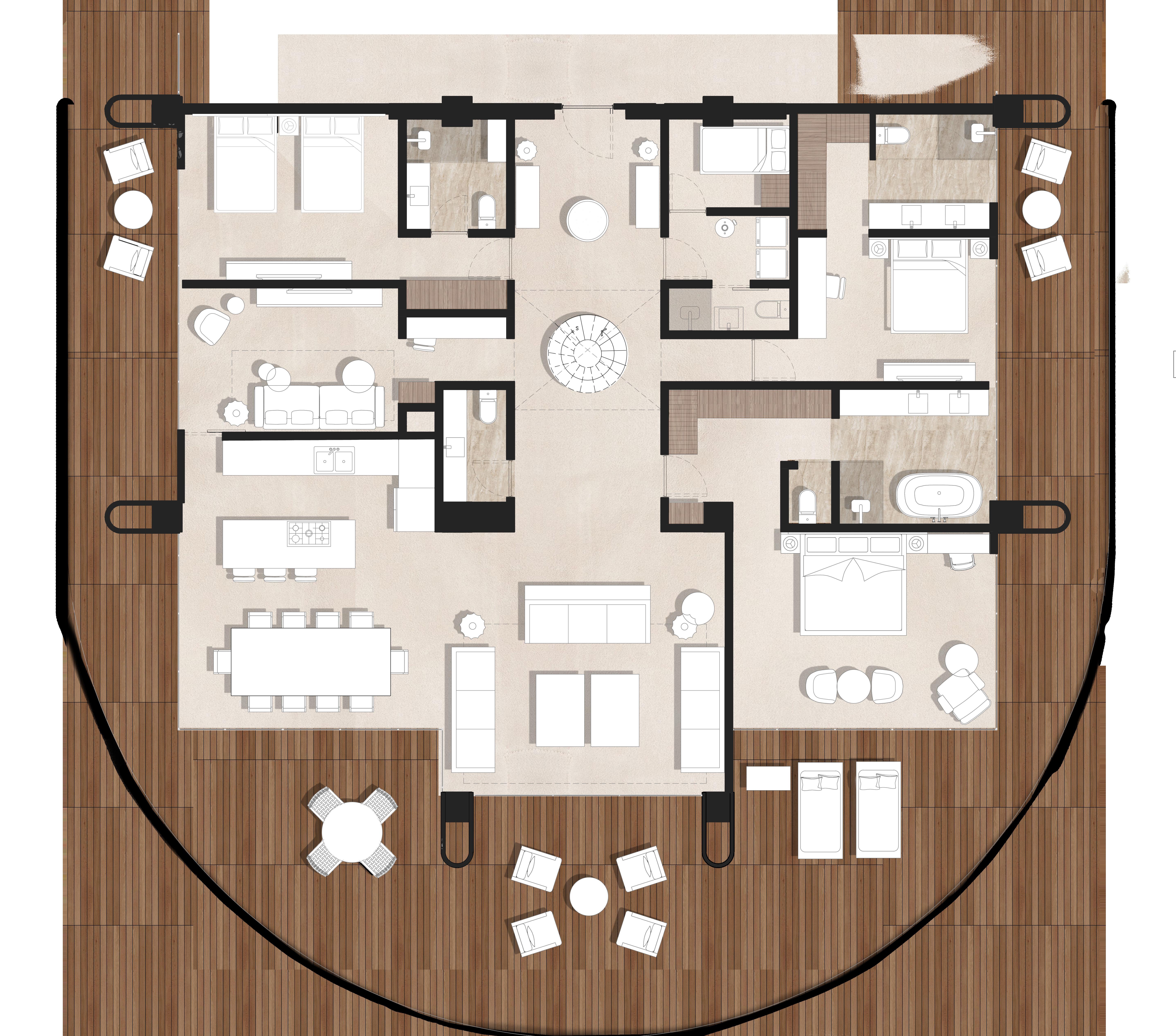Zonna N.01 Playa del Carmen, spans a 234,718 ft2 site, with 656 ft of beachfront along the iconic Mamita's Beach. This mixed-use development features a luxury hotel with 64 suites, a residential area with 172 apartments, 15 villas and four commercial spaces. The construction will be completed in three phases.