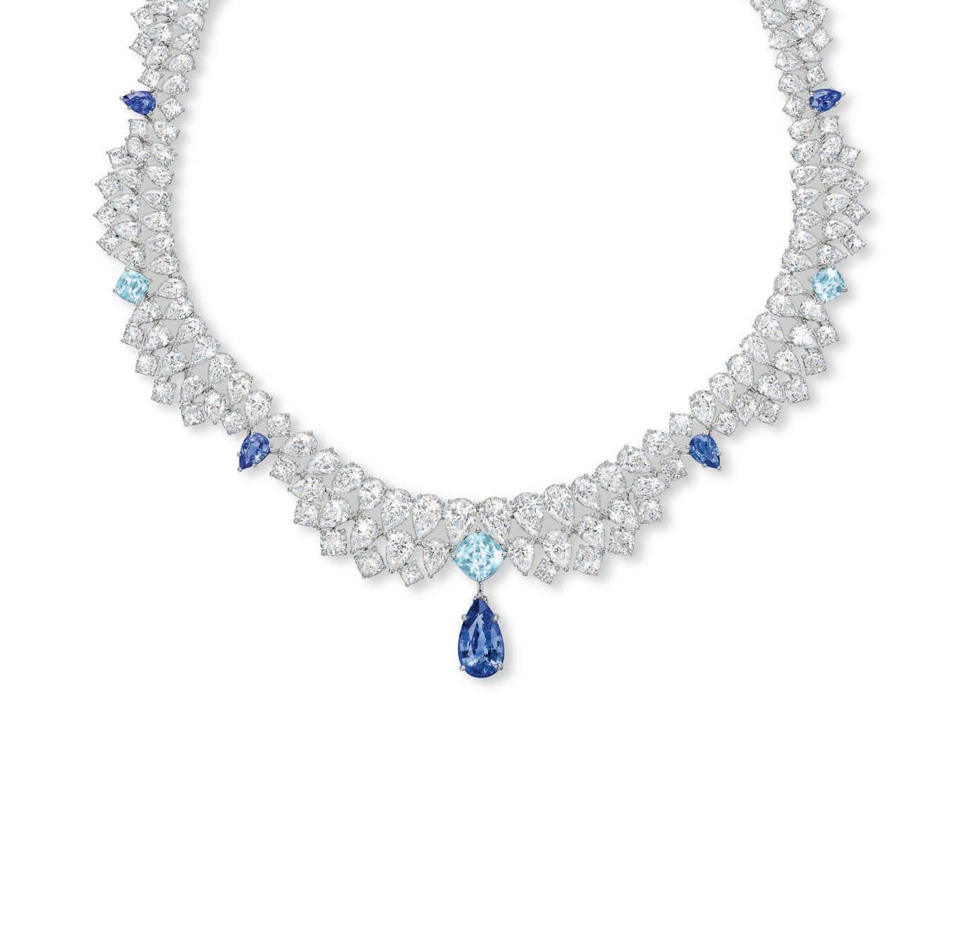 White-gold necklace set with a 123.35-ct sugarloaf Royal Blue sapphire (Sri Lanka), 331 buff-top sapphires (26.91 ct), 30 pear-shaped diamonds (16.49 ct), 98 round diamonds (34.79 ct), 14 oval diamonds (18.63 ct), 212 step-cut diamonds (9.50 ct) and pavé-set diamonds (8.50 ct).