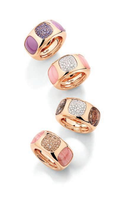 Bisanzio Capsule Collection in rose gold featuring rose gold with phosphosiderite and violet sapphires, pink opal and tourmalinated quartz with diamonds, rhodochrosite with brown diamonds. pomellato.com