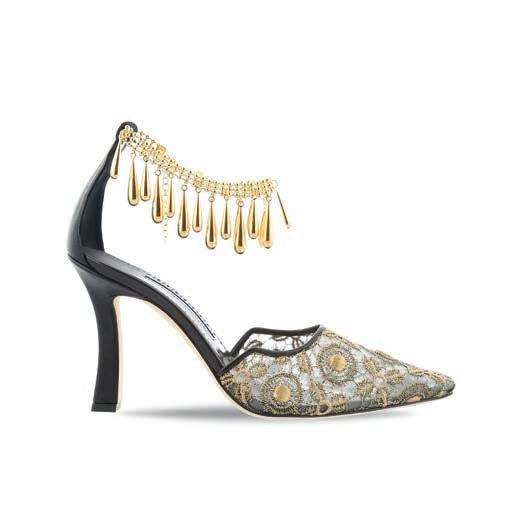 Embellished pumps in lace and crystal, with gold fringe detailing. manoloblahnik.com