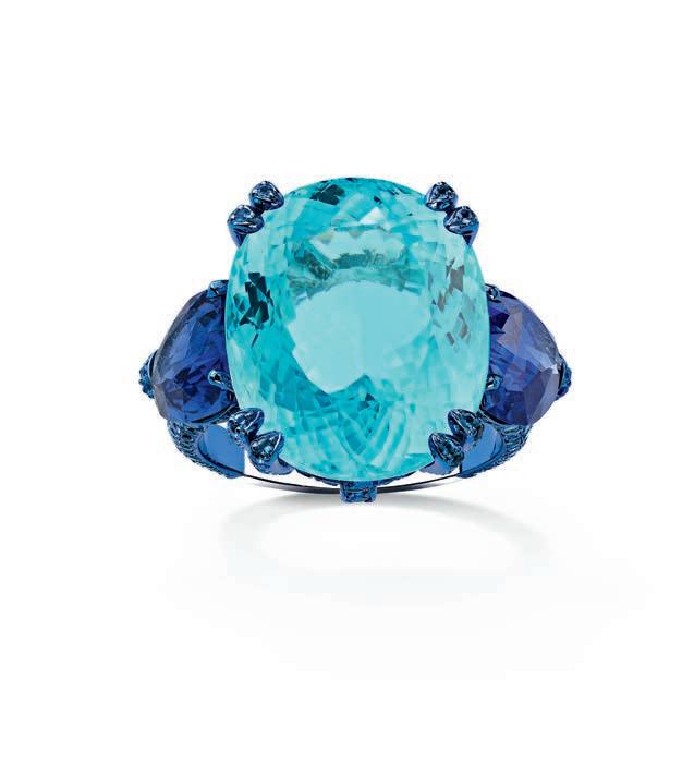 Ring in 18k ethical white gold and titanium, set with a Paraiba tourmaline flanked by two Royal Blue sapphires totalling 7.52 ct, and brilliant diamonds and sapphires (2.11 ct).