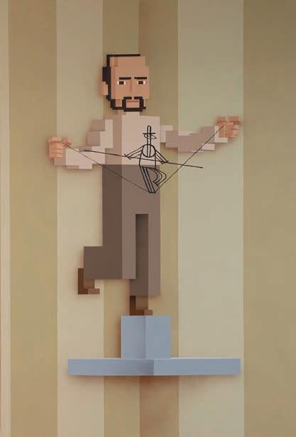 Around him unfold characters drawn from literature, music, art history, or the artist’s own doubles, each pixelated, fragmented and recomposed as if caught in the act of redefining themselves. The tightrope walker becomes a guide through these mental landscapes, where exile is no longer only geographical but deeply internal.
