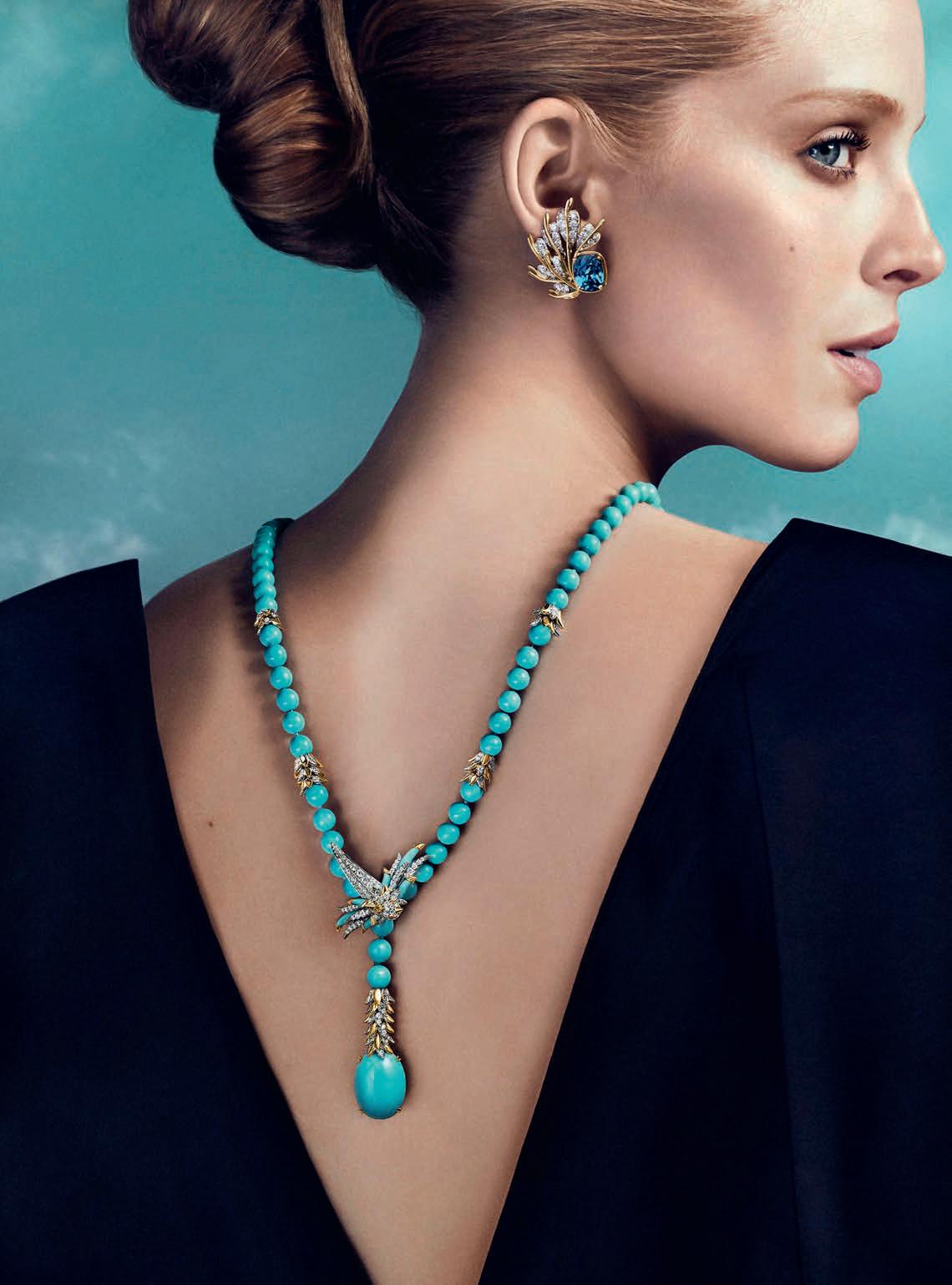 Tiffany opens this chromatic journey with the Bird on a Rock sautoir: a vibrant turquoise, as light as dawn. One of the Maison’s most poetic creations, it interlaces yellow gold and celestial stones in a soft, almost marine movement. A talisman of light, it evokes the serene depths of the ocean.