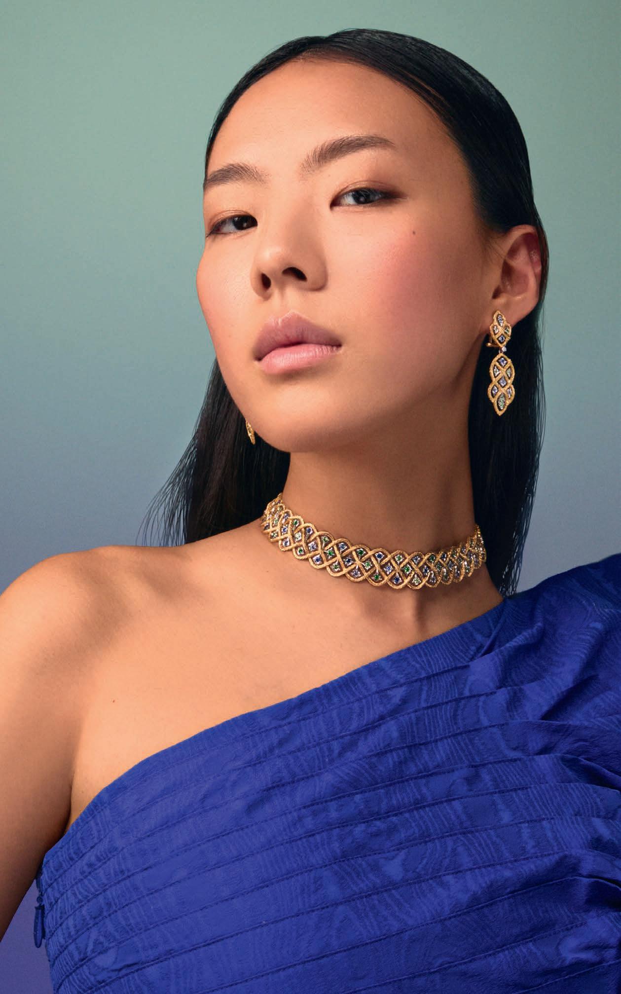 Buccellati enters the scene with its Étoilée Color collection, sculpting azure through its legendary openwork craftsmanship. Yellow and white gold intertwine in fine, pulsating patterns that vibrate on the skin like Renaissance fabrics.