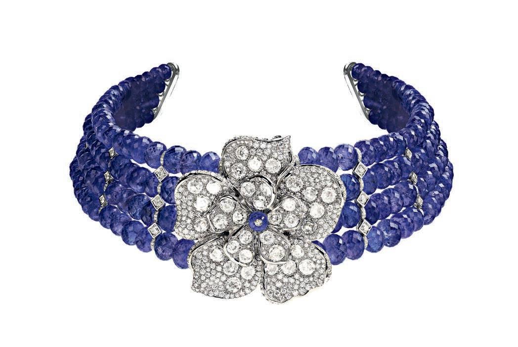 Choker in tanzanite composed of 599.50 ct of tanzanite beads, with a floral motif in 18k ethical white gold and brilliant-cut diamonds (20.79 ct).