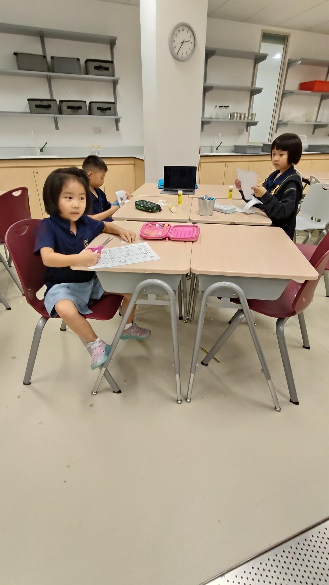 Y2 SCL students are familiarizing themselves with school facilities. After completing speaking tasks, they create houses independently by cutting out windows and doors, pasting them onto house outlines, coloring, and drawing pictures of familiar individuals.