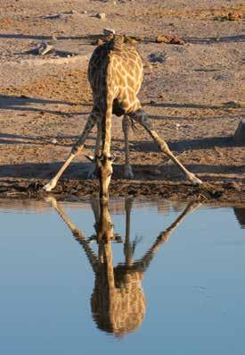 A giraffe drinks at a water hole in Etosha National Park, Namibia.