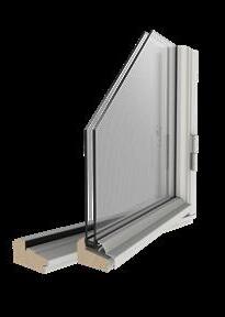 Fönster med 3 ­ glas isolerglaskassett. Som standard är ett glas alltid energiglas och en spalt fylld med Argon. Det går att uppgradera glaskassetten för bättre U ­ värde.