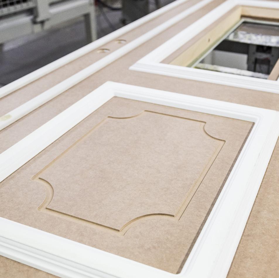 Modellen får sin form – utfräsningar för mönster, glas och lås görs med millimeterprecision. Har du valt en modell med dekorpålimmad utsida görs det manuellt, precis som så många andra detaljer. Där maskinerna begränsas, tar människorna vid. Och det är just tack vare blandningen av innovation, hantverk och kunskap som gör processen så effektiv och exakt.