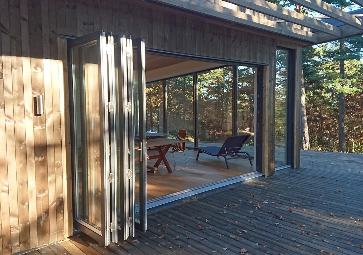 Med en karm i fura och dörrblad i accoyaträ får vikdörrarna en gedigen formstabilitet. Behåll träkänslan rakt igenom eller addera väderskydd i form av slitstak aluminium på utsidan.