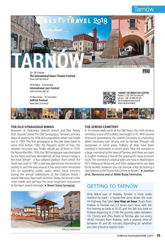 GETTING TO TARNÓW Only 80km east of Kraków, Tarnów is most easily reached by road - a hassle-free drive down the new A4 highway that takes less than an hour. Buses from Kraków to Tarnów run 2-3 times each hour, with the first leaving as early as 05:55 and the last bus back to Kraków departing at 21:00; the journey takes between 1hr 15mins and 2hrs. Trains to Tarnów also run every 30-60 minutes from Kraków, with a journey time of between 45 and 85 minutes depending on whether you take a local or express train. krakow.inyourpocket.com