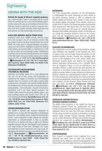 Sightseeing VIENNA WITH THE KIDS Behind the façade of Vienna’s imperial opulence, you might wonder if there is any space left for simple down-to-earth family fun in this city. Thankfully opportunities abound for year-round outdoor entertainment, festivals, concerts, street fairs, as well as museums, theatres and other creative activities where both kids and their parents can feel comfortable and welcome. HAUS DES MEERES (AQUA TERRA ZOO) Featuring more than 10,000 animals, Vienna’s Aqua Terra Zoo occupies one of six massive concrete flak gun towers built by the Nazis shortly before the end of WWII. The huge space is divided between terrariums, aquariums and aviaries. Highlights include the feeding of the sharks and piranhas (Mon at 10:30 & Fri at 15:30) as well as other animals (posted online). Thrillseekers may find a trip up the rock climbing wall on the outside of the flak tower a fun jaunt before viewing the weekly shark dive (Thu at 18:00).QF‑3, Fritz-Grünbaumplatz 1, MNeubaugasse, tel. +43 1 587 14 17, www.hausdes-meeres.at. Open 09:00-18:00; Thu 09:00-21:00. Admission €18,90/8,60. TECHNISCHES MUSEUM WIEN (TECHNICAL MUSEUM) Attention technology geeks: this is your playground! You can use all of your senses and imagination to experience the stages of scientific and technological progress from its inception to the latest cutting-edge achievements. Permanent and special exhibits feature the development of heavy industry, energy production, transportation, communication, musical instruments, computers and a lot more. Special programs for children offer interactive learning, holiday games, and even birthday parties with friends. Trams N°52 or 58 from Westbahnhof.QD‑4, Mariahilferstrasse 212, tel. +43 1 89 99 80, www.technischesmuseum.at. Open 09:00-18:00; Sun, Sat 10:00-18:00. Admission €13, children under 19 free. ZOOM KINDERMUSEUM The ZOOM is Austria’s only museum dedicated to children up to 14 years old. The exposition is divided into four areas - main exhibit, ocean, studio and animated film centre - and is designed to make cultural and scientific information as comprehensible to kids as possible. The focus is on games and play, as well as on sensory cognitive process. Kids are encouraged to ask questions and make things of their own. Teenagers can create animated films or even record their own pop songs. An ideal place for families to spend a stimulating afternoon. QG‑3, Museumsplatz 1, MMuseumsquartier, tel. +43 1 524 79 08, info@kindermuseum.at, www. kindermuseum.at. Open 08:00 - 16:00. Closed Sat, Sun. Exhibition admission free. 38 Vienna In Your Pocket