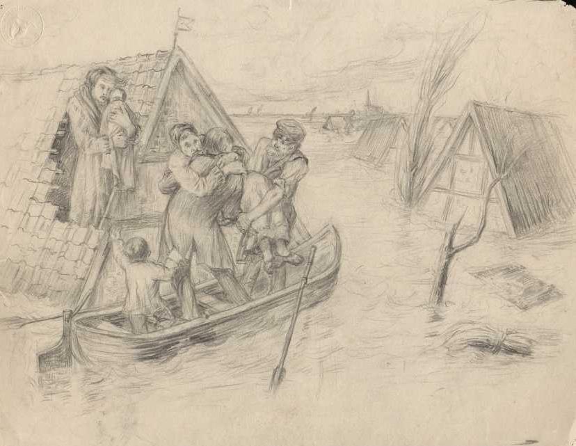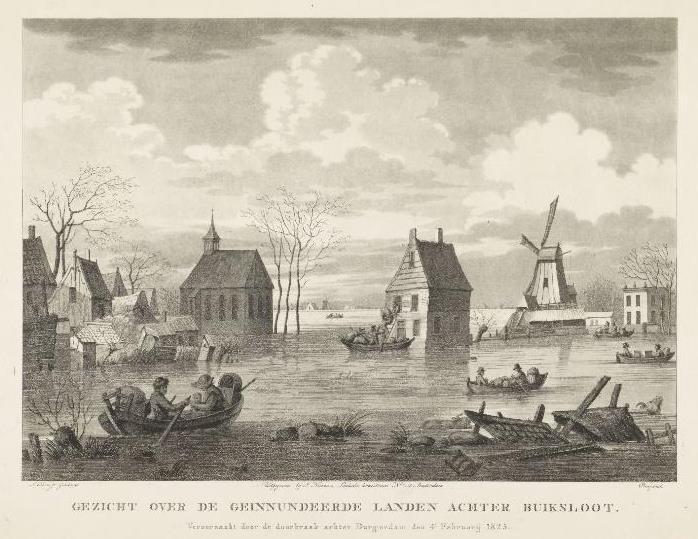 οι κεραυνοί στον ουρανό. Στο κέντρο διακρίνεται η κατάρρευση του φράγματος και το νερό που πλημμυρίζει την εκκλησία, σπίτια και χωράφια. Η πλημμύρα του Φεβρουαρίου του 1825, ήταν μια καταστροφική πλημμύρα που σημειώθηκε από τις 3 έως τις 5 Φεβρουαρίου του 1825 στην ακτή της Βόρειας Θάλασσας, στην οποία πνίγηκαν περίπου 800 άνθρωποι. Στην Ολλανδία, στην οποία έχουν σημειωθεί διαχρονικά πολλά πλημμυρικά φαινόμενα, η πλημμύρα του Φεβρουαρίου του 1825 ήταν η χειρότερη φυσική καταστροφή του 19ου αιώνα. Οι περισσότεροι από τους νεκρούς και οι χειρότερες ζημιές καταγράφηκαν στο Groningen, τη Friesland και το Overijssel. Μεγάλο μέρος της Ολλανδίας βρίσκεται κάτω από την επιφάνεια της θάλασσας. Η απειλή των πλημμυρών είναι επομένως πάντα παρούσα. Για τον έλεγχο της στάθμης του νερού δημιουργήθηκαν αναχώματα, φράγματα, ανεμόμυλοι και πόλντερ. Ωστόσο, αυτά τα μέτρα ασφαλείας μερικές φορές απέτυχαν. Κάθε αιώνας γίνονταν μάρτυρας καταστροφικών Μ1 Δευκαλίωνας: Εκπαίδευση για τις Πλημμύρες