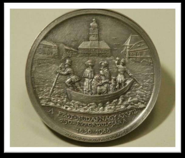 ΠΗΓΗ ΤΟΥ ΕΡΓΟΥ Το έκθεμα είναι αναμνηστικό ασημένιο νόμισμα, διαμέτρου 42 mm, που εκδόθηκε για την 150ή επέτειο από την πλημμύρα του Δούναβη το 1838. Στη μια πλευρά του υπάρχει ανάγλυφο το πορτραίτο και σε κυκλική επιγραφή το όνομα του βαρόνου Miklós Wesselényi, ο οποίος έσωσε πολλές ζωές στην πλημμύρα του 1838 στη Βουδαπέστη. Στην άλλη πλευρά του νομίσματος έχει χαραχτεί σκηνή διάσωσης κατά τη διάρκεια της πλημμύρας με κεντρικό θέμα τη βάρκα του βαρόνου Miklós Wesselényi. Αυτό το αναμνηστικό νόμισμα εκδόθηκε το 1988, για την 150ή επέτειο της πλημμύρας του 1838, στην Πέστη Βούδα, σημερινή Βουδαπέστη και περιλαμβάνεται στα εκθέματα του Ουγγρικού Μουσείου Περιβάλλοντος και Διαχείρισης Υδάτων – Μουσείο Δούναβη Ο Βαρόνος Miklós Wesselényi συμμετείχε ενεργά στις επιχειρήσεις διάσωσης και με μια βάρκα για πέντε μέρες, με αυτοθυσία διέσωσε πολλούς ανθρώπους από τα παγωμένα νερά και έμεινε γνωστός ως « ο βαρκάρης της πλημμύρας ». Για την ηρωική του δράση στη διάσωση των πλημμυροπαθών του 1838 και την προσφορά του, θεωρείται εθνικός ήρωας των Ούγγρων. Η αγάπη των Ούγγρων για τον βαρόνο διαφαίνεται σε έργα τέχνης, όπως αγάλματα, ανάγλυφες πλάκες, πίνακες, λογοτεχνικά έργα, κ.ά. που αφιερώθηκαν σ’ αυτόν. Έργα τέχνης για την πλημμύρα του 1838 και τη δράση του Miklós Wesselényi εκτίθενται στην Ψηφιακή Έκθεση στις