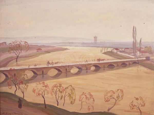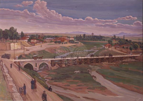 Χρονολογείται στα 1884 και απεικονίζει τη μεγάλη πέτρινη γέφυρα του Πηνειού στη Λάρισα με τα νερά του ποταμού υπερχειλισμένα να έχουν φθάσει λίγο κάτω από τις κορυφές των τόξων της γέφυρας. Οι μελετητές σημειώνουν ότι πίσω από τη γέφυρα στη δεξιά όχθη του ποταμού υπάρχει μικρή στεγασμένη ξύλινη κατασκευή στηριγμένη σε χοντρές δοκούς. Πρόκειται για ένα από τα καφενεία που υπήρχαν διάσπαρτα στις όχθες του Πηνειού. Στο βάθος διακρίνονται κτίσματα από τη συνοικία Ταμπάκικα. Στη γέφυρα συνωστίζονται άνθρωποι με χαρακτηριστικές ενδυμασίες της εποχής και ζώα. Ο Πηνειός είναι ποταμός