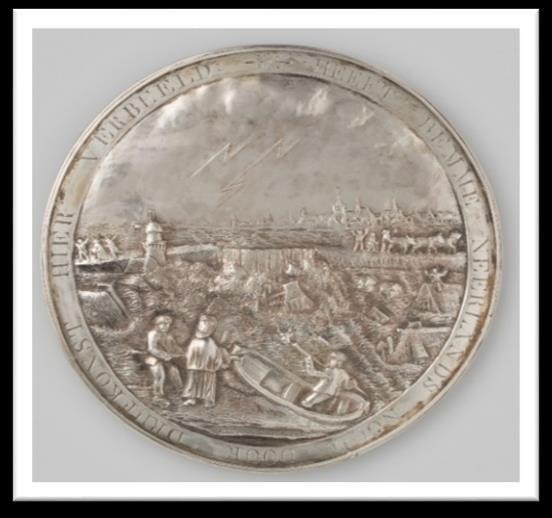 Το έκθεμα είναι αργυρό ιστορικό μετάλλιο, έργο χαρακτικής, με διάμετρο 9 ,9 cm, αφιερωμένο στη μνήμη της τρομερής πλημμύρας της 4ης και 5ης Φεβρουαρίου 1825 που έπληξε την Ολλανδία. Το μετάλλιο περιλαμβάνεται στα εκθέματα του Rijksmuseum στο Άμστερνταμ. Στη μια πλευρά του μεταλλίου απεικονίζεται μνημείο με επιγραφές, στην κορυφή του οποίου βρίσκονται τρεις βάρκες και επάνω από αυτές ένας άγγελος που κρατά στεφάνι. Ακτίνες φωτός από τον ουρανό αγκαλιάζουν το μνημείο. Στα αριστερά διακρίνεται ένα πλοίο που βυθίζεται και άνθρωποι σε μια βάρκα απομακρύνονται για να σωθούν. Στην άλλη πλευρά του μεταλλίου απεικονίζεται σκηνή από την πλημμύρα ενώ η καταιγίδα μαίνεται, όπως μαρτυρούν