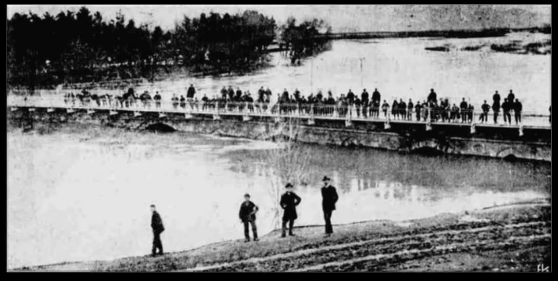 της Λάρισας. Η φωτογραφία περιλαμβάνεται στη συλλογή της ΦΩΤΟΘΗΚΗΣ Λάρισας Ο Πηνειός, για άλλη μια φορά πλημμύρισε και τα νερά του έχουν σχεδόν φτάσει στο κατάστρωμα της γέφυρας. Στο οδόστρωμα της γέφυρας έχουν συγκεντρωθεί πολλοί άνθρωποι και παρατηρούν τα φουσκωμένα νερά του ποταμού.