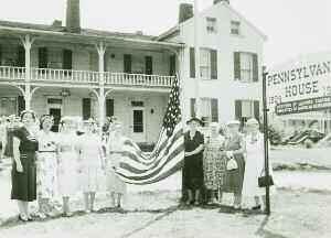 Top: (left) Pennsylvania House, 1956. Women holding flag flown over U.S. Capital. (right) Pennsylvania House after its restoration in 2005-2006.