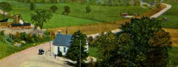 A short distance west of the Brick Tavern, the old National Road diverges to the left (south) and into Lloydsville, another Pike town. Just after leaving U.S. 40, you will cross a stone bridge. Just past the bridge, on the left, watch for the old wooden posts and steel cable, a predecessor to the guard rails of today Continue through town, turn left and return to U S 40, passing the Jamboree in the Hills site, a venue for one of the region’s largest country music festivals.