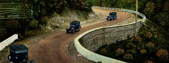 On the south side of the Road just west of town is a well-preserved bypassed (bricked) segment of original roadbed. The curve and steeper incline were eliminated when the Road was upgraded in the 1920s