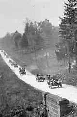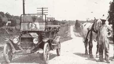 Two early 1900s modes of transportation on new concrete segment of Road between Zanesville and Hebron.
