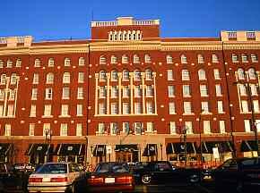 Now converted to Shawnee Place Apartments, the 1915 Shawnee Hotel on the northeast corner of Main Street and Limestone is an impressive eight-story Neo-Classical hotel building designed by H. Ziegler Dietz of St. Louis. The building features a massive cornice and a two-story lobby with a grand staircase to the balcony and marble and walnut trim.