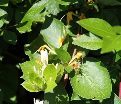 This climbing plant, usually found in woodland and hedgerows, is an invaluable addition to a planting list for any wildlife garden. Its flowers open at twilight and it produces the most scent at night so that it attracts moths that feed on its nectar and pollinate the flowers. The leaves are the food plant for the caterpillar of the aptlynamed Honeysuckle Moth (Ypsolopha dentella) and arboreal small mammals like dormice eat its flowers too. The creamy-white flowers turn yellow on pollination and the plant produces small clusters of bright red berries. (1)