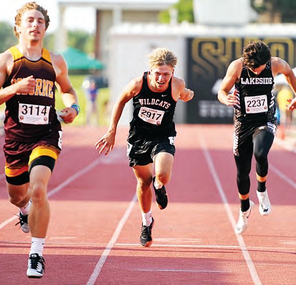 Marmaton Valley High’s Jaedon Granere, center, leans across the nish line while taking third in the Class 1A 200-meter dash at Saturday’s state track meet. REGISTER/RICHARD LUKEN