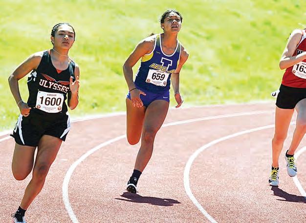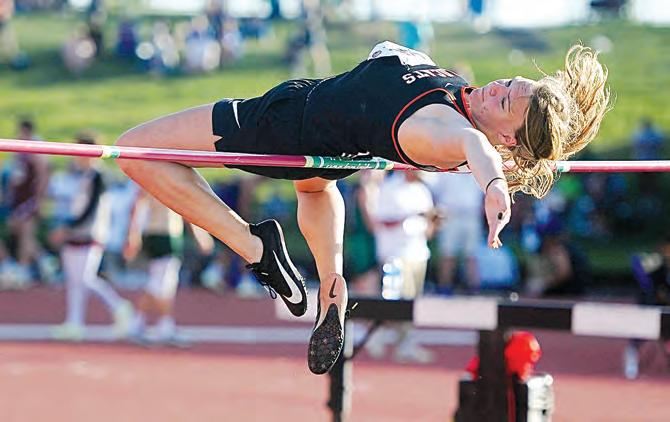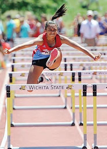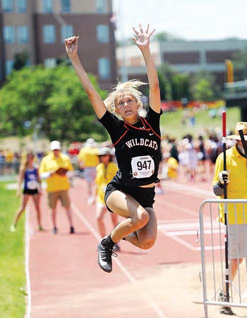 Clockwise from upper left, Marmaton Valley High’s Janae Granere medals in both the long jump and triple jump at the Class 1A State Track meet; Marmaton Valley’s Piper Barney, who later medals in the triple jump, runs the 300-meter hurdles; Crest High’s Mia Coleman clears a hurdle in the 100-meter hurdles prelims; Marmaton Valley’s Kaitlyn Drake clears the high jump bar; Crest High’s Brenton Edgerton crosses the nish line during the 100-meter dash prelims; Crest High’s Ethan Godderz competes in the long jump. REGISTER/RICHARD LUKEN