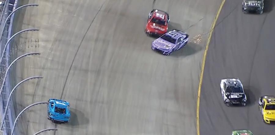 who started the race alongside Chastain on the front row — spun out on pit road while losing a right-rear wheel, causing a caution shortly thereafter and ultimately not factoring for the win.