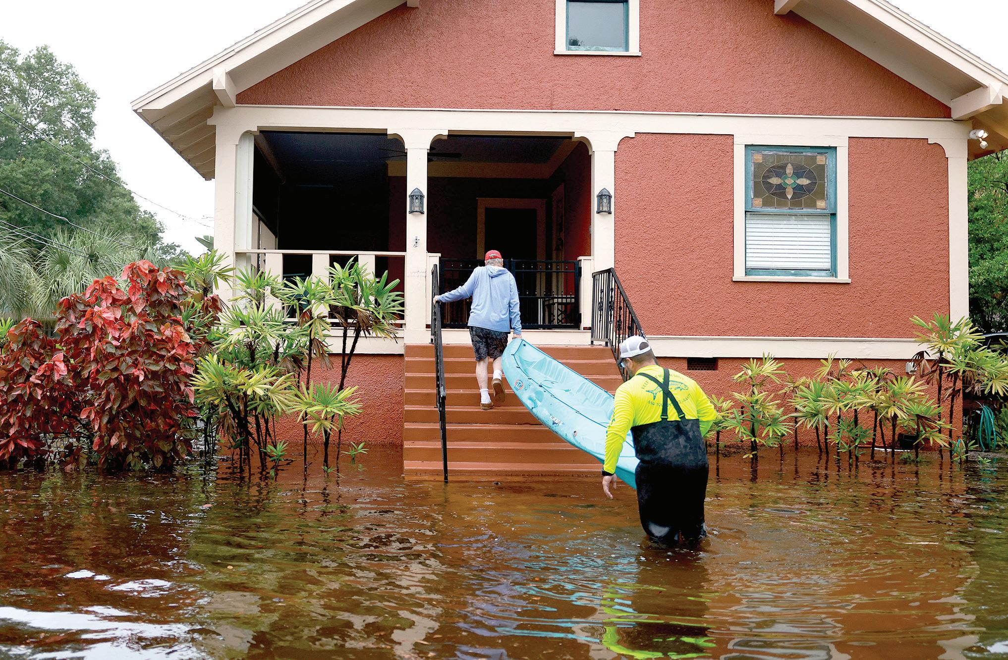 David Rudd helps Steve Odom, left, carry a kayak onto his porch through the flooded streets caused by Hurricane Idalia passing offshore on Wednesday, in Tarpon Springs, Florida. (JOE RAEDLE/GETTY IMAGES/ TNS)