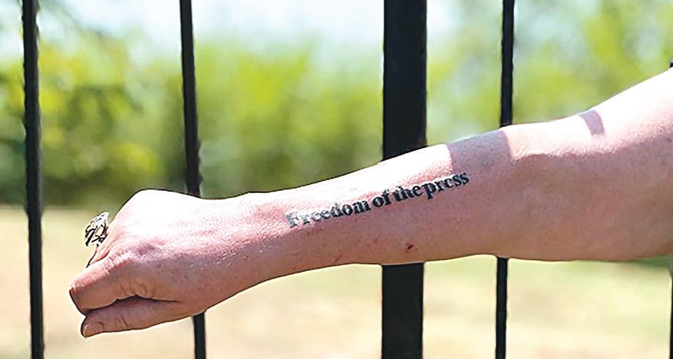 Marion County Record reporter Deb Gruver on Wednesday had the words “freedom of the press” tattooed on her arm. In her lawsuit, she accuses Police Chief Gideon Cody of “recklessly” violating her constitutional rights. SUBMITTED BY DEB GRUVER TO KANSAS