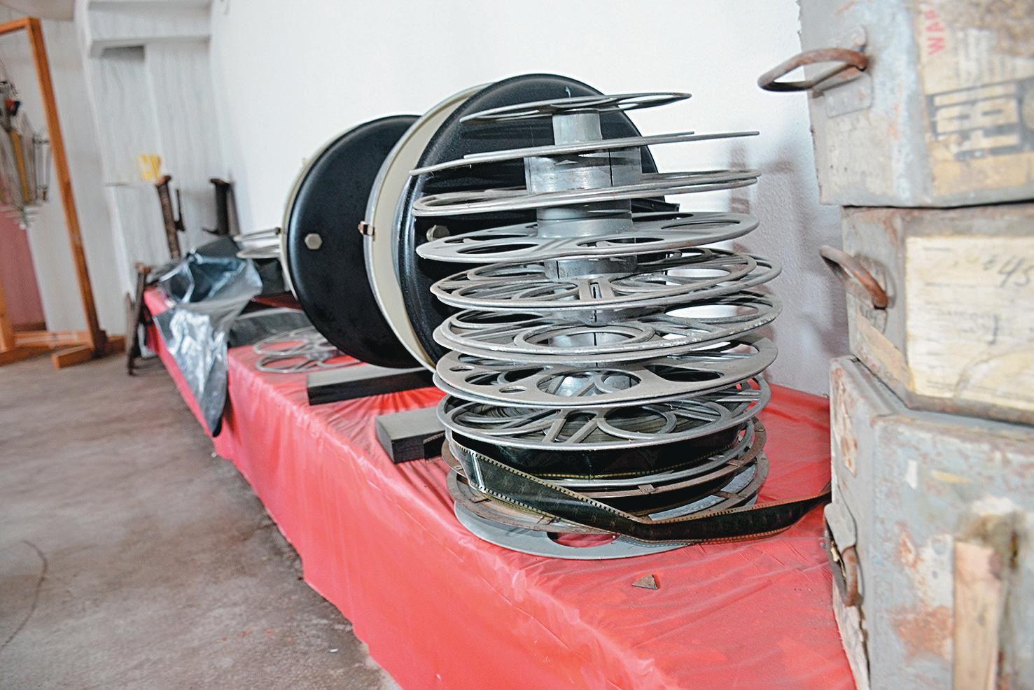 Much remains to be done to restore the old Iola Theatre building, which has been vacant for the past dozen years. Crews from 5M Construction, at lower left, have begun reinforcing the bricks along the roof on the north side this week. At lower right is a stack of film reels used in the theatre’s heyday. REGISTER/RICHARD LUKEN