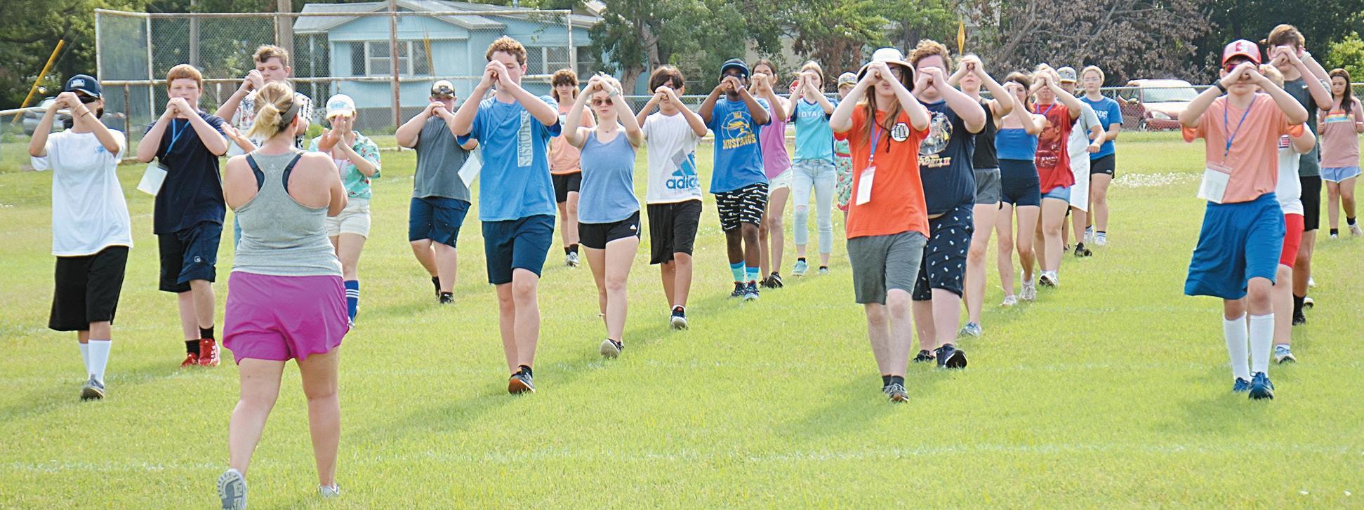 Iola High School and Iola Middle School band instructor Brandi Holt leads her musicians through a marching exercise Wednesday morning as part of a weeklong band camp. REGISTER/RICHARD LUKEN
