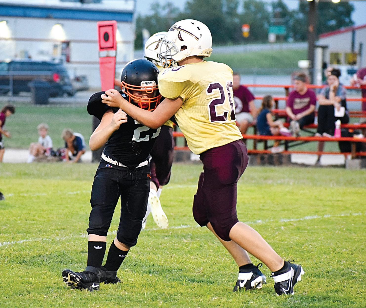 Marmaton Valley Junior High’s Hunter Berntsen blocks a St. Paul player Thurs day. MVHS/TAYVEN SUTTON