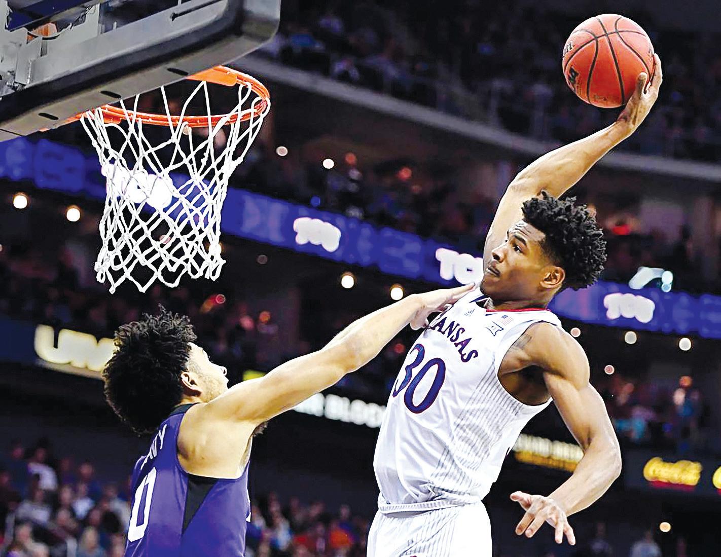 Kansas’ Ochai Agbaji throws down a dunk over TCU’s Micah Peaby during a Big 12 Tourament game in Kansas City, Mo. THE KANSAS CITY STAR/ RICH SUGG/TNS