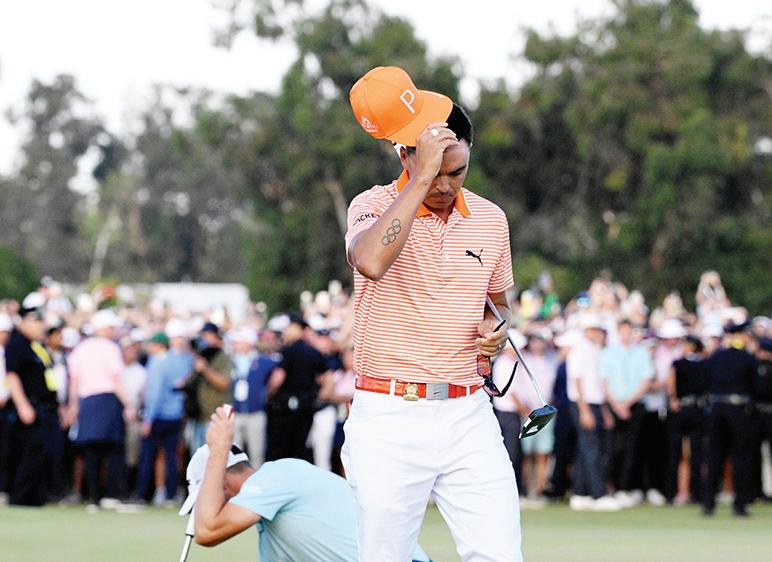 holes settling for pars on a relatively easy course, Morikawa had four birdies on both the front and back nine. Morikawa made a 10foot putt at No. 12, his fourth birdie in a sixhole stretch that put him within a shot of Fowler, and his 9-footer for birdie at No. 14 pulled him into a tie
