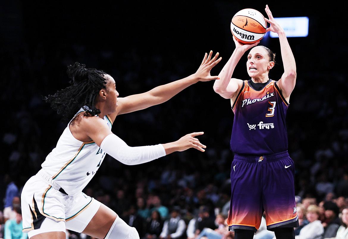 Diana Taurasi (3) of the Phoenix Mercury shoots a three-pointer defended by Kayla Thornton (5) of the New York Liberty. DUSTIN SATLOFF/GETTY IMAGES/TNS
