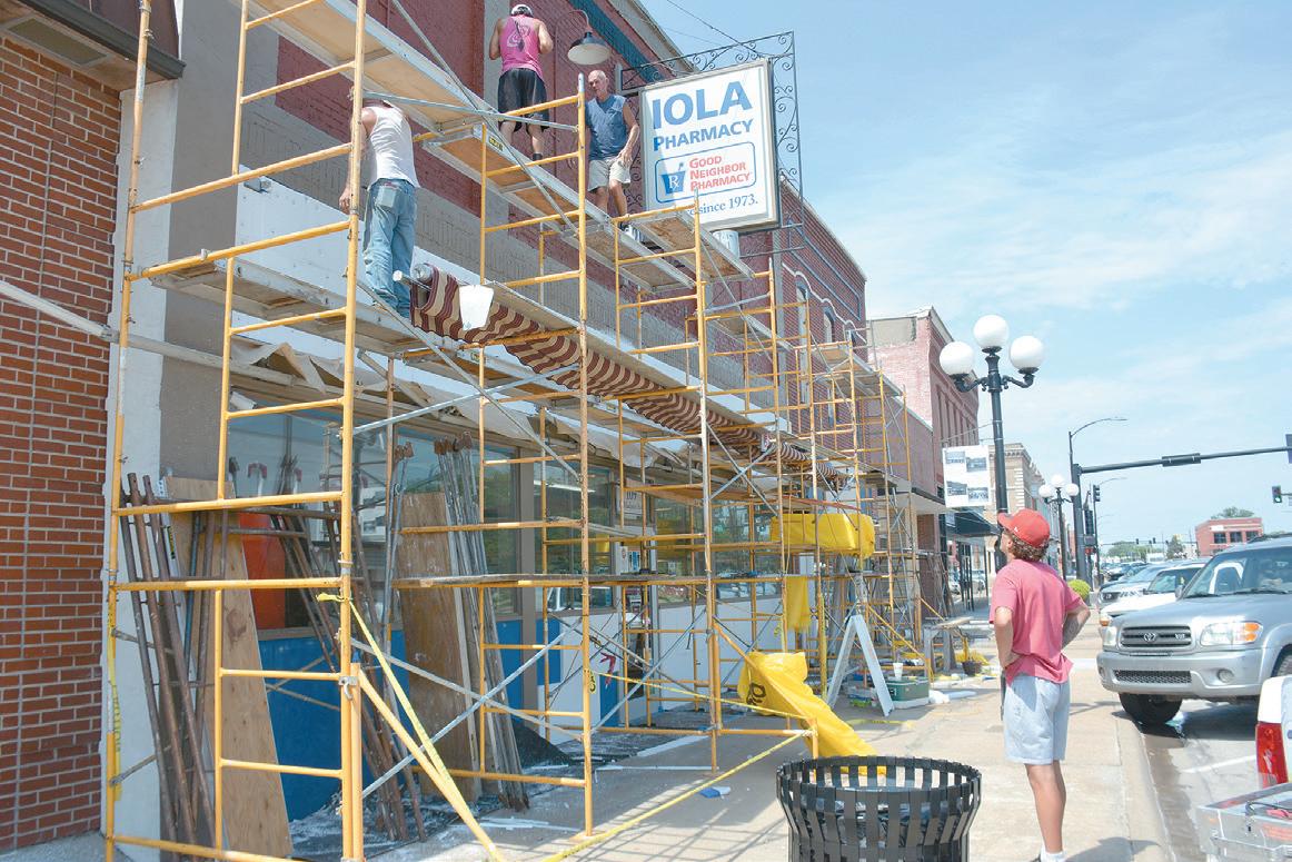 Jim Arnott and wife Mary Ann have stressed family connections since Jim purchased what became Iola Pharmacy in 1973. Below, crews remodel the exterior of the pharmacy in the run-up to the pharmacy’s 50th anniversary celebration. REGISTER/VICKIE MOSS