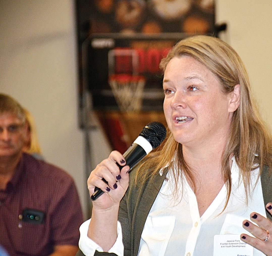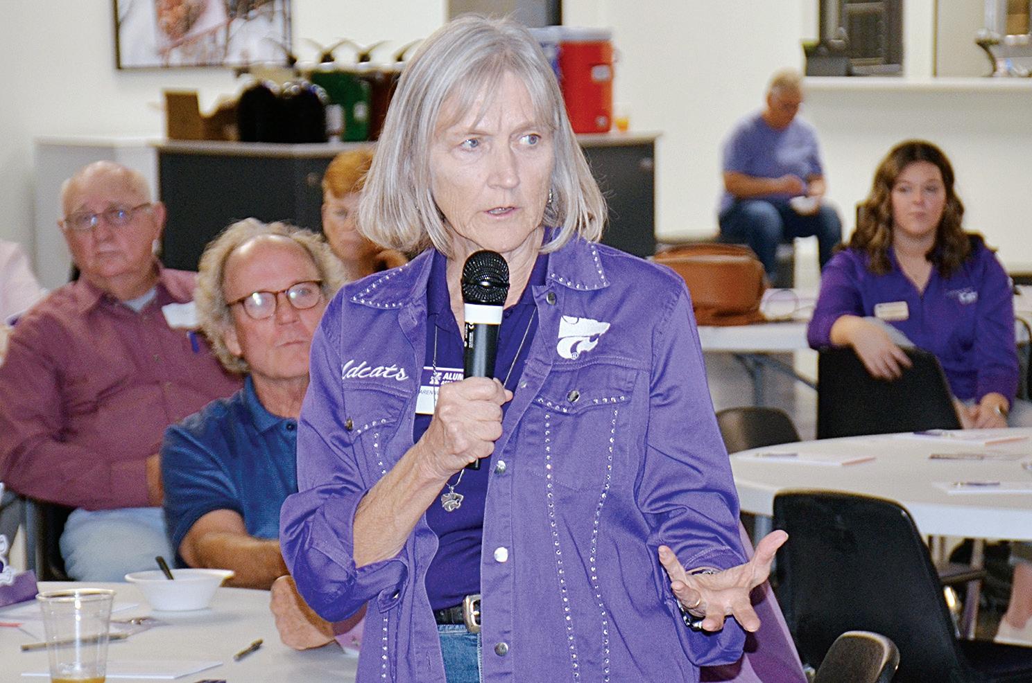 Karen Works of Humboldt speaks at a community conversation with Kansas State University representatives and alumni Wednesday, part of the delegation’s two-day visit to Allen County.